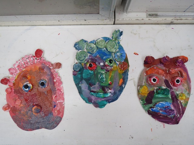 自分達で書いたオニの顔の形に切ったベニヤ板に、粘土で目や鼻や口をつくって貼り、リキテックスで彩色しました。個性豊かなオニの作品がたくさんできあがりました!
