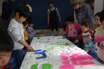 積み木の箱を裏返し、直方体でレールをつくってケルンモザイクを飾って、ビーズのタイヤを走らせて遊びました。その後、発砲スチロール板をスチロールカッターで好きな形にカットして、画用紙に貼り、ローラーをかけて版画を作成。大迫力の抽象画が完成しました。2016年度、皆でつくる最後の作品となりました。