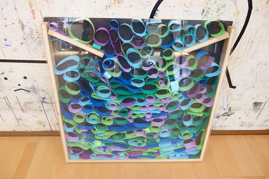 球の第2弾は肉まんづくり。皮づくりでは麺棒をつかって自分の顔よりも大きな丸をつくり、具を中央にのせてくるっと指でつまんでとじました。ほかほかふわふわの肉まん、是非お家でつくってみてね。肉まんを蒸す間、長短様々の画用紙をテープでとめてわっかづくり。出来たわっかをテリトリー板のケースに転がしていくのですが、なんともいえないスピードで転がりはずむわっかに大喜びの子ども達でした。